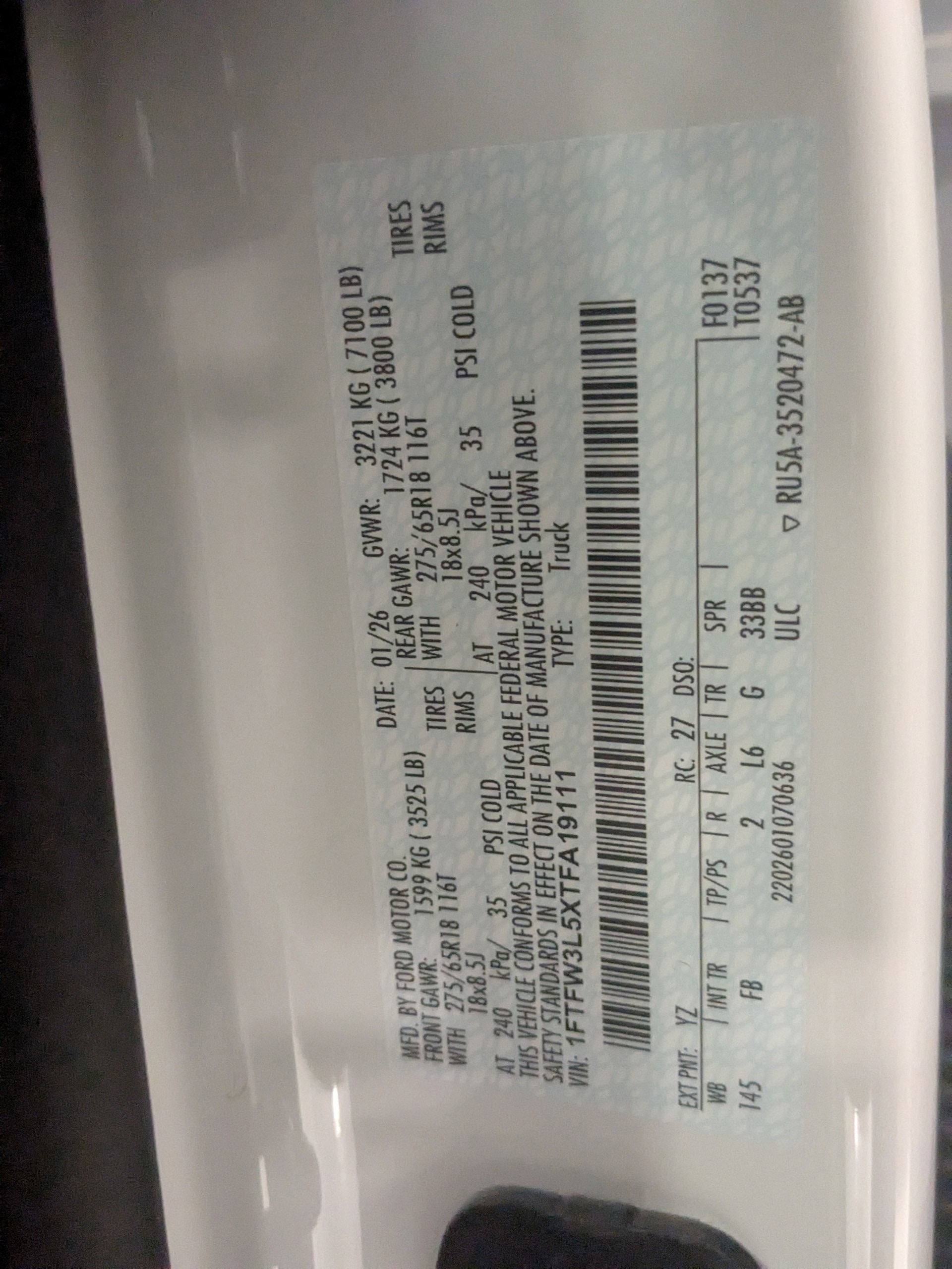 - ENGINE: 5.0L V8 -inc: auto start-stop technology GVWR: 7 100 lbs Payload Package 3.31 Axle Ratio 50-State Emissions Standard equipment on 2.7L (99P) and 5.0L V8 (995) Automatically added to 3.5L Ecoboost (998) and 3.5L PowerBoost full hybrid (99D) orders from dealers located in the following California emissions states: California Massachusetts New York Oregon Pennsylvania Vermont and Washington Available 3.5L Ecoboost (998) and 3.5L PowerBoost full hybrid (99D) option for dealers in federal states for all order types (retail / stock / fleet): Arizona Connecticut Delaware Idaho Maine Maryland Montana New Hampshire New Jersey Nevada Ohio Rhode Island and West Virginia Available option for dealers located in all states for retail orders Available option for dealers located in all states for commercial / rental fleet orders Available option for dealers located in all states for government fleet orders w/ship-to addresses in California emissions states